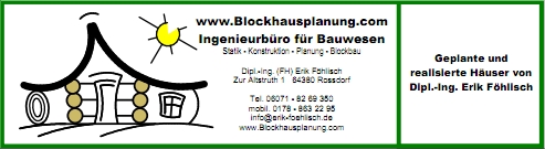 Ingenieurbüro und Blockhausplanung mit kostenfreier Erstberatung direkt hier im Ingenieurbüro (oder am Telefon) nach vorheriger Terminvereinbarung.